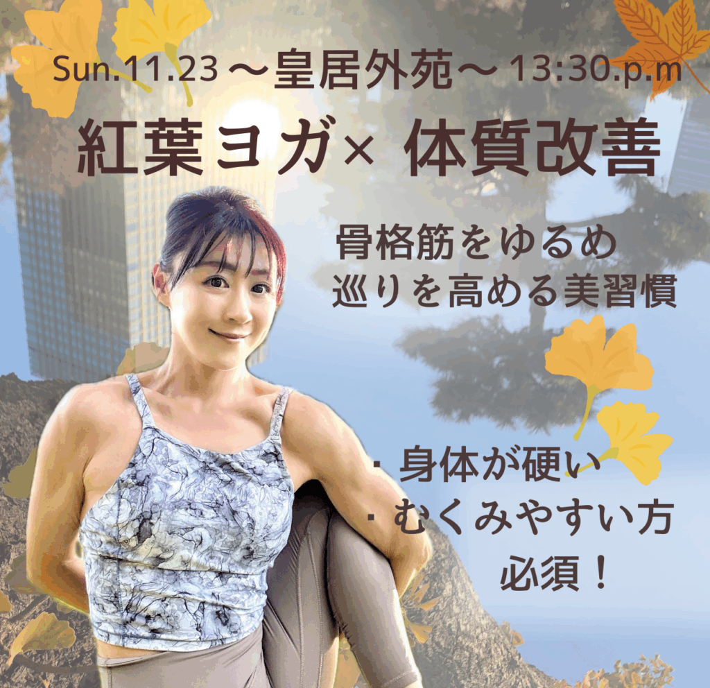 そんなタイミングに合わせて、11月23日(日)に 皇居外苑にて「紅葉ヨガ×体質改善イベント」 を開催します。